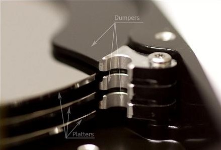 Precious information stored on platters. Platters made of polished aluminum or glass and covered with several layers of different compounds including ferromagnetic layer which actually stores all the data. As you can see part of the platter covered with the Dumper. Dumpers sometimes called as Separators located between platters, they reduce air fluctuations and acoustic noise. Usually dumpers made of aluminum or plastic. Aluminum dumpers better for cooling air inside HDA.
