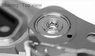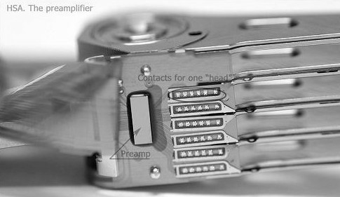 As you can see slider’s surface is not flat, it has aerodynamical grooves. These grooves help a slider fly on the certain height. Air under the slider forms Air Bearing Surface or ABS. ABS makes slider fly almost parallel to the platter’s surface. There is very important part of HSA which we haven’t discussed yet. It called the preamplifier or preamp. The preamp is a chip, which controls heads and amplifies signals from/to them.The reason why the preamp located inside HDA is simple – signals from heads are very weak and on modern HDDs have more than 1GHz frequency, if take the preamp out of HDA such weak signals wouldn’t survive, they will disappear on the way to PCB.