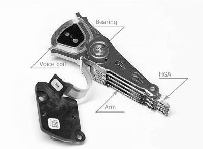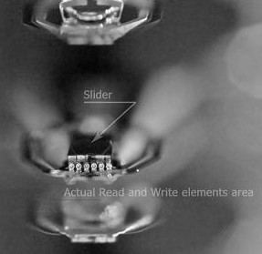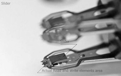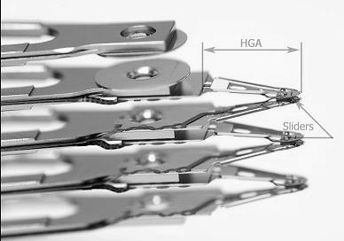 The black small things at the end of HGAs called Sliders. In many sources you can find that sliders claimed as actual heads but a slider itself is not a head it’s a wing which helps read and write elements fly under the platter’s surface. Heads flying height on modern HDDs is about 5-10 nanometers. For example: an average human’s hair is about 25000 nanometers in diameter. If any particle goes under the slider it could immediately overheat (because of friction) the heads and kill them that’s why clean air inside HDA is so important. The actual read and write elements located at the end of the slider and they are so small that can only be seen under a good microscope.