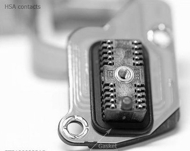 The gasket makes connection airtight. The only way for air to go inside HDA is through the breathing hole. On this drive contacts covered with thin layer of gold, for better conductivity.